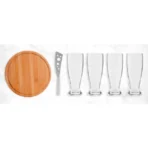 Kit para queijo e cerveja; Conta com tábua redonda para queijo/petiscos; Faca para frios em metal; Quatro copos para cerveja em vidro. Estão perfeitamente acomodados em uma caixa para presentear.