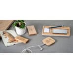 Bateria portátil em bambu. Bateria de lítio com capacidade de 5.000 mAh e tempo de vida ≥ 500 ciclos. Contém indicador de carga, uma porta micro USB de entrada, uma porta USB-C de entrada/saída e uma porta USB-A de saída. Incluso cabo USB-C para carregar. Fornecido em caixa presente de papel kraft. A cor e o resultado da impressão nos materiais naturais pode variar entre produtos. 120 x 51 x 15 mm