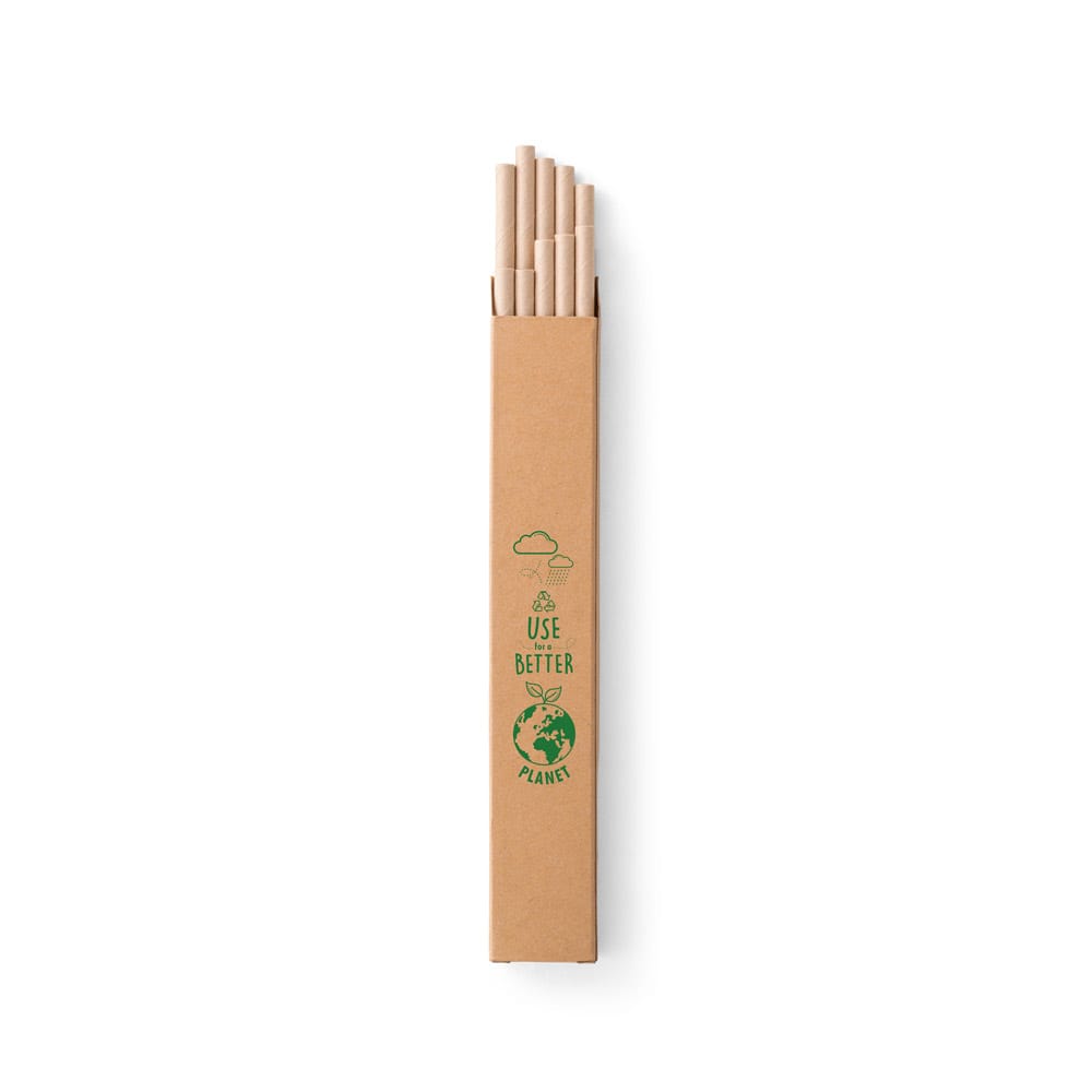 Conjunto de 10 canudos de uso único em papel kraft. Fornecidos em caixa presente de papel kraft. Canudo: ø6 x 196 mm | Caixa: 33 x 200 x 14 mm
