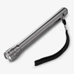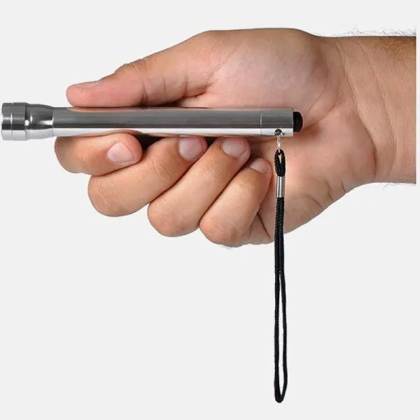 Confeccionada em alumínio escovado e botão emborrachado localizado na base do produto, possui alça de mão e lâmpada de luz branca. Funciona através de duas pilhas AAA não inclusas. ESPECIFICAÇÕES TÉCNICAS