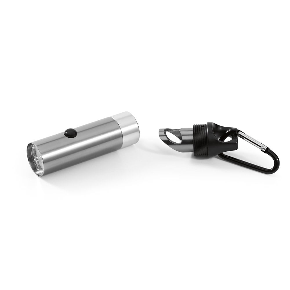 Lanterna em alumínio com 6 LEDs, abridor de garrafas e mosquetão. Incluso 2 pilhas CR2032. ?25 x 102 mm