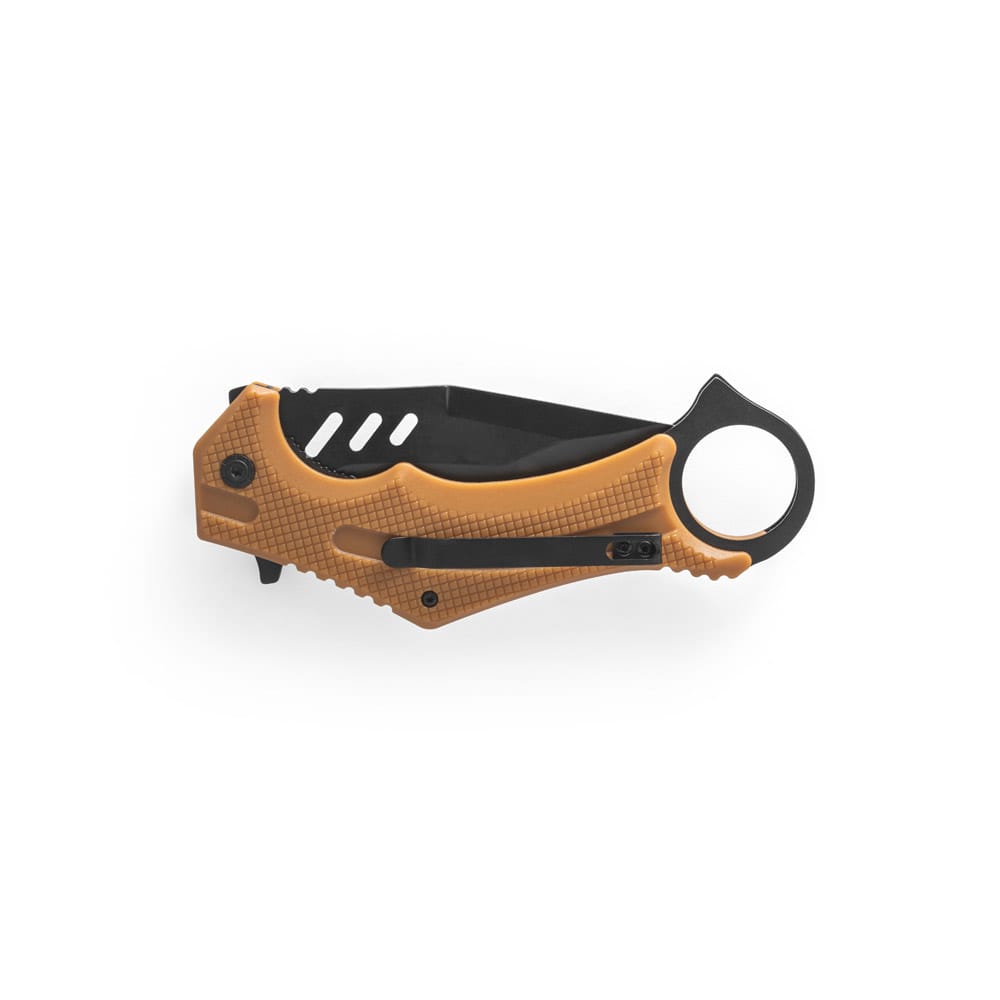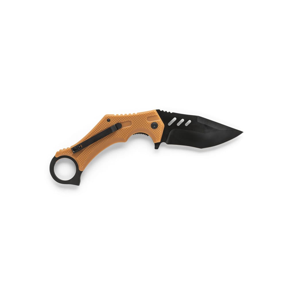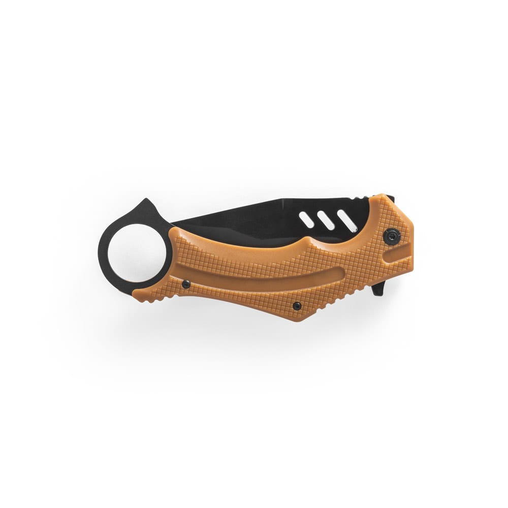 Canivete dobrável em aço inox e cabo em plástico. Aberta: 230 x 40 x 10 mm | Fechada: 140 mm