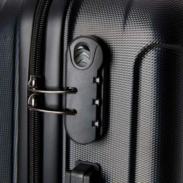 Mala de viagem em ABS rígido preto. Conta com rodinhas 360º, fechamento em zíper e cadeado com senha, alça retrátil de alumínio e duas alças de mão. Parte interna com forro e divisória com zíper.