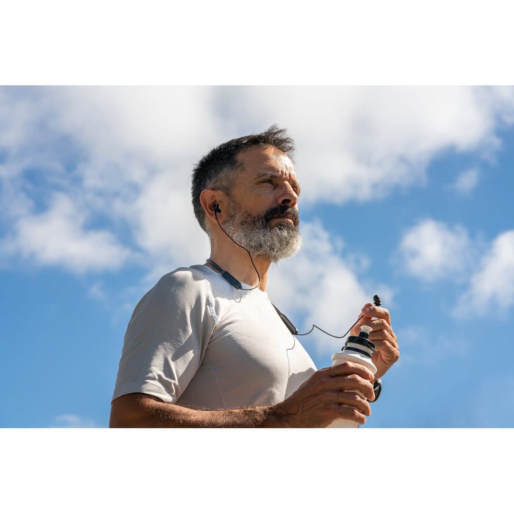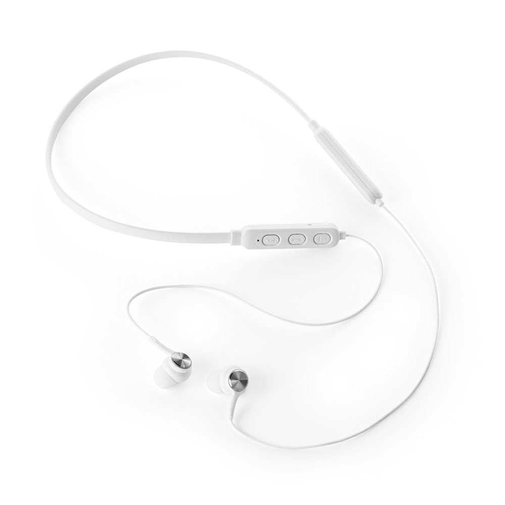 Fone de ouvido em PC. Transmissão sem fios BT v5.0 com banda para pescoço com autonomia aproximada de 7 horas. Função para atender chamadas, controle de volume e conexão à playlist do dispositivo móvel. Incluso cabo USB / micro USB para carregar. Fornecido em bolsa em non-woven. 190 x 200 mm