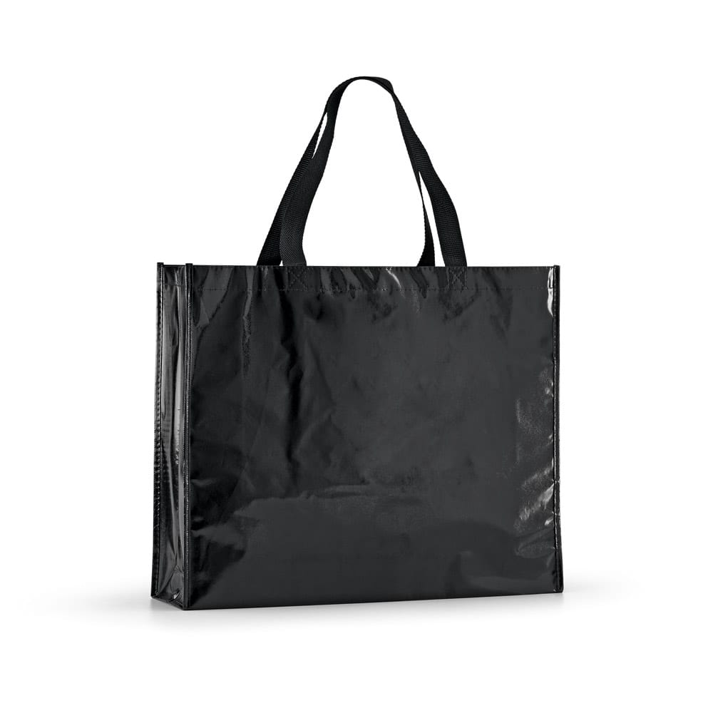 Sacola em non-woven laminado (120 g/m²) com laminação brilhante. Alças em webbing de 60 cm. 420 x 320 x 150 mm