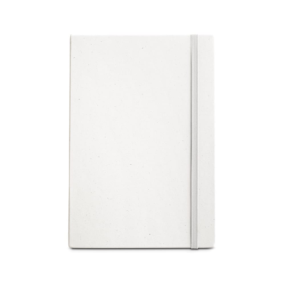 Caderno A5, de capa dura, produzida através de embalagens de leite reciclados, ajudando ao reaproveitamento do cartão e alumínio contido nas embalagens. Contém 80 folhas, em papel reciclado, pautadas cor de marfim, fita separadora e elástico para fecho do caderno. 145 x 210 mm
