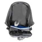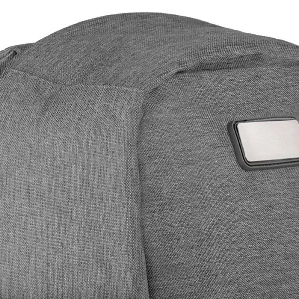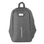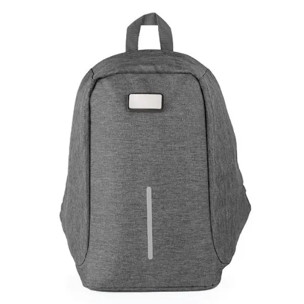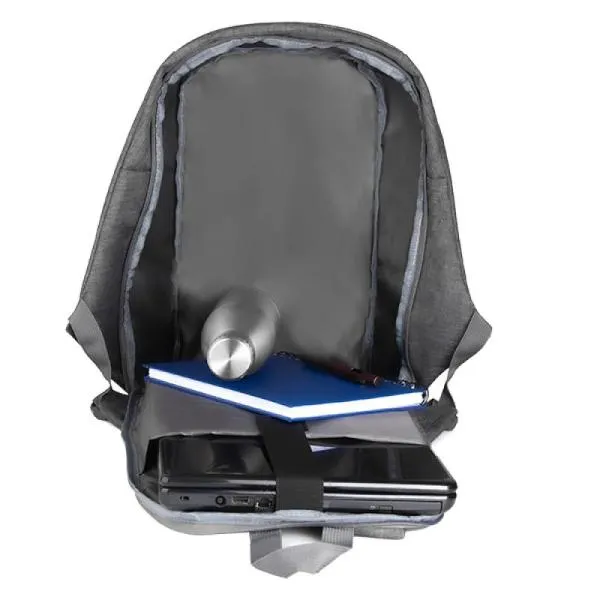 Mochila antifurto cinza em Poliéster 300D Melange Cinza. Conta com alças para as costas; alça para as mãos; alça para colocar na alça da mala; compartimento interno para notebook de até 15"; faixas refletivas na parte frontal.