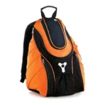 Mochila laranja e preta confeccionada em Polyester 300D. Conta com compartimento interno em tela, alças ajustáveis, três bolsos externos com zíper, sendo dois laterais e um frontal com divisória em tela elástica e orifício para fone de ouvido. Possui ainda alça de mão e um bolso frontal inferior em tela elástica. *IMAGEM ILUSTRATIVA, NÃO ACOMPANHA O PAR DE TÊNIS*