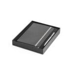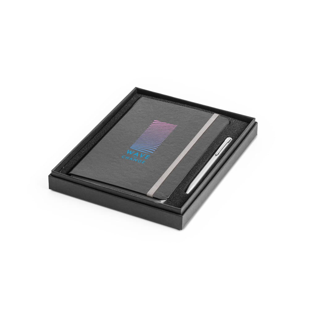 Conjunto esferográfica e caderno A5. A esferográfica é em alumínio com clipe de ferro e é de mecanismo twist com escrita a azul. O caderno A5 de capa dura com 80 folhas pautadas de cor marfim, fita separadora, elástico e bolso interior. Conjunto fornecido em caixa de oferta. Esferográfica: ø10 x 138 mm | Caderno: 137 x 210 mm | Caixa: 190 x 240 x 30 mm