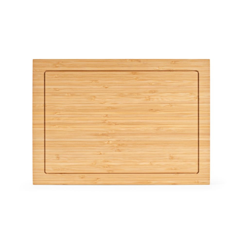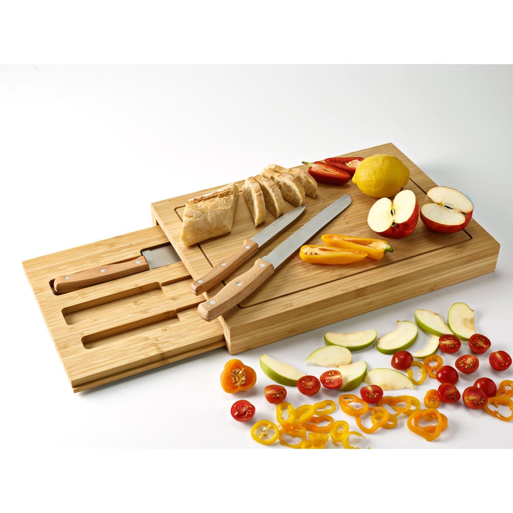 Conjunto de tábuas em bambu com 3 facas inclusas. Composto por duas tábuas: a tábua exterior e a tábua interior que assume duas funcionalidades - um compartimento para três facas inclusas (faca de legumes, faca de pão, faca de cozinha) e como tábua de corte. Fornecida em caixa presente em papel kraft reciclado. Certificação EU Food Grade. A cor e o resultado da impressão nos materiais naturais pode variar entre produtos. 390 x 280 x 45 mm | Tábua exterior: 390 x 280 x 15 mm | Tábua interior: 380 x 250 x 15 mm
