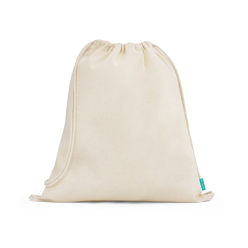 Sacola tipo mochila 100% algodão orgânico (120 g/m²) com alças. Proveniente de um cultivo sustentável, sem químicos ou pesticidas e Label Organic. 370 x 410 mm
