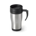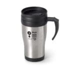 Caneca de viagem térmica de aço inox e PP, de parede dupla isolada a ar. Capacidade até 420 mL. Preserva as bebidas quentes por 4h e frias por 2h. Fornecida em caixa presente branca. Certificação EU Food Grade. ø80 x 170 mm