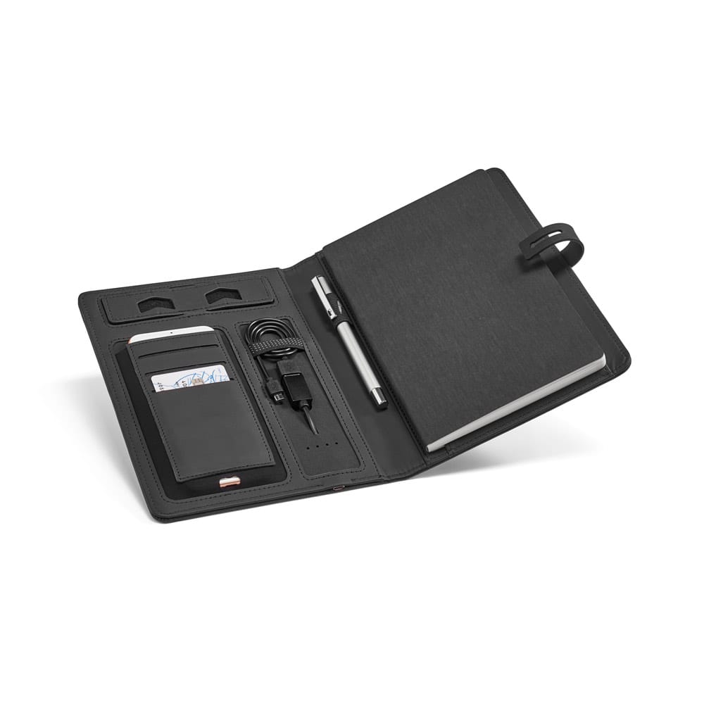 Pasta A5 em c. sintético com bateria portátil embutida (lítio). A bateria tem capacidade para 4.000 mAh, tempo de vida ≥ 500 ciclos com entrada/saída 5V/1A e cabo USB / micro USB para carregar a bateria. No interior, contém um caderno removível com 64 folhas pautadas de cor marfim, um suporte para esferográfica (não inclusa), elásticos para organização e suporte para smartphone. No exterior, uma placa com acabamento emborrachado, LED interior e botão on/off. Fornecida em caixa presente. 165 x 225 x 25 mm | Placa: 55 x 35 mm | Caixa: 180 x 240 x 35 mm