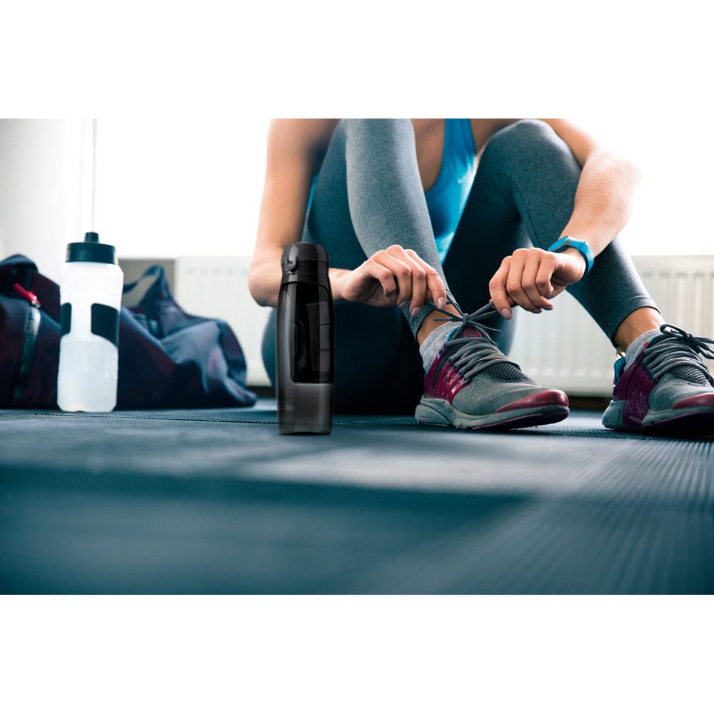 Squeeze em Tritan™ com tampa flip top em PP, compartimento em ABS para cartões, chaves e dinheiro. Capacidade até 800 mL. Fornecida em caixa. Certificação EU Food Grade. ø80 x 260 mm