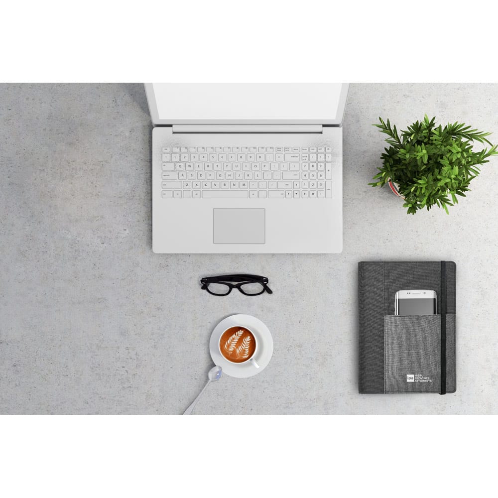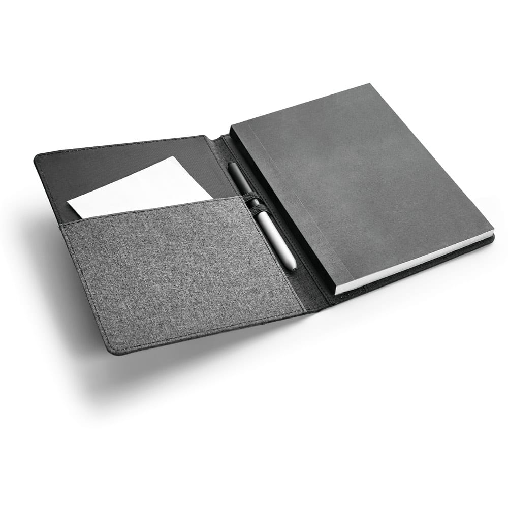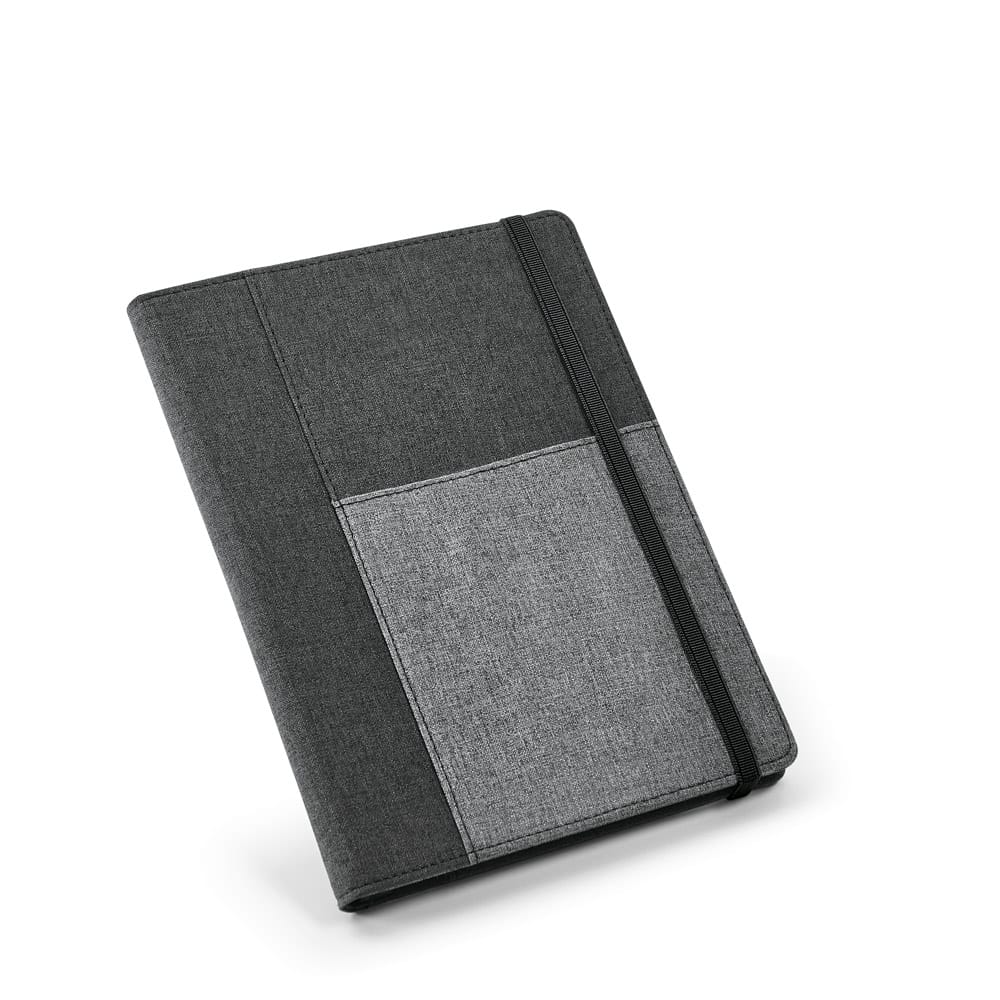 Capa de tecido em poliéster, com caderno A5 removível com 80 folhas lisas. O interior contém um bolso interior e suporte para esferográfica (não inclusa). Fornecida em embalagem de non-woven. 160 x 220 mm | Bolsa: 205 x 250 mm