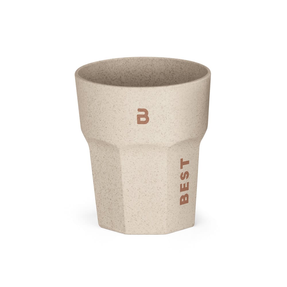 Copo em fibra de arroz (60%) e PP (40%) com acabamento mate. Capacidade até 400 mL. Certificação EU Food Grade. ø88 x 102 mm