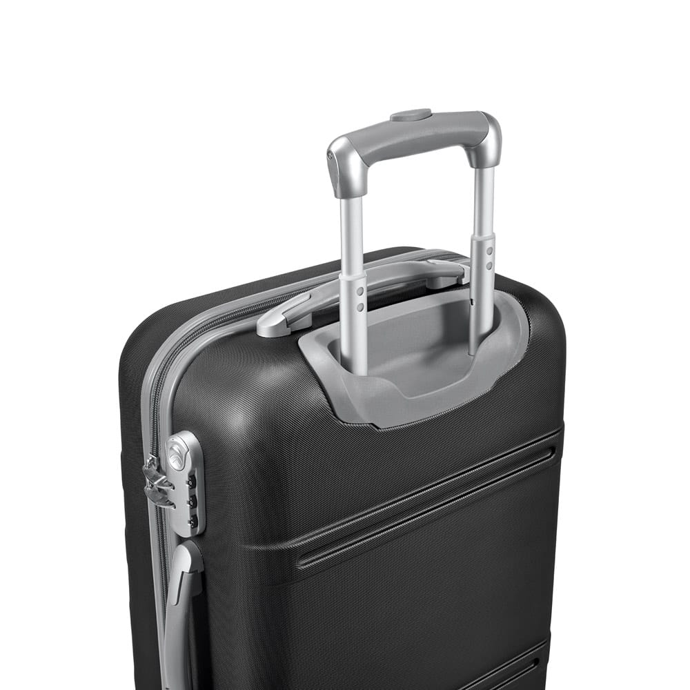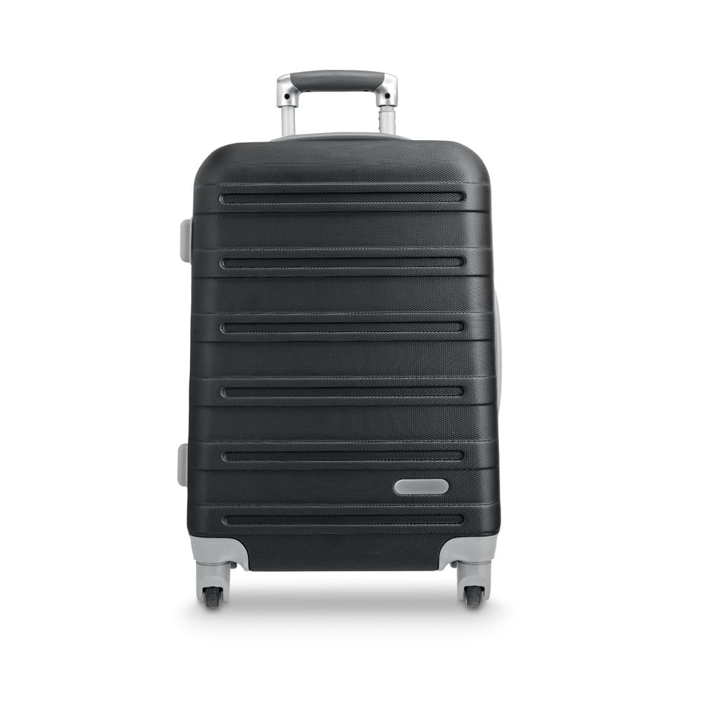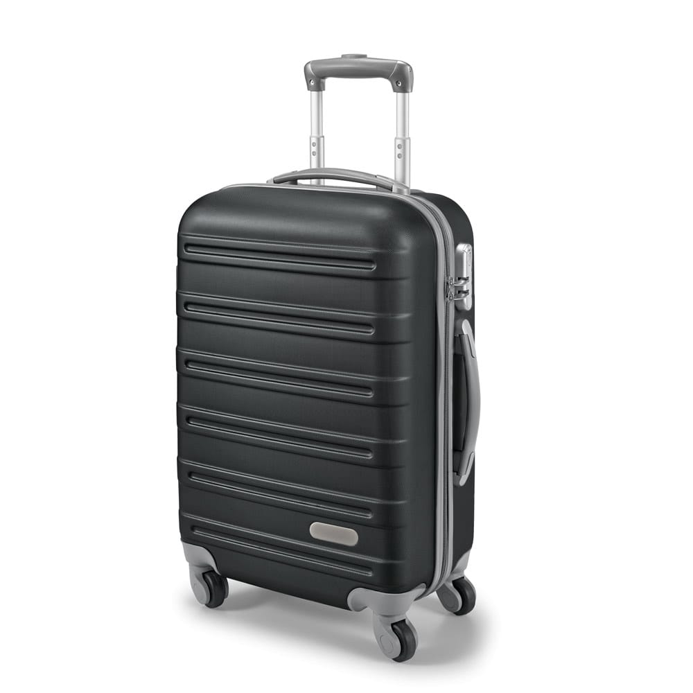 Mala de viagem executivo em ABS com interior forrado, com divisória. Fecho de segurança com senha na lateral, 4 rodas giratórias, pega extensível em alumínio, com mola (altura da pega estendida até 435 mm) e placa metálica removível, para fácil gravação. Mala com capacidade até 36 L e peso de 2,80 kg. 370 x 570 x 220 mm | Placa: 60 x 15 mm