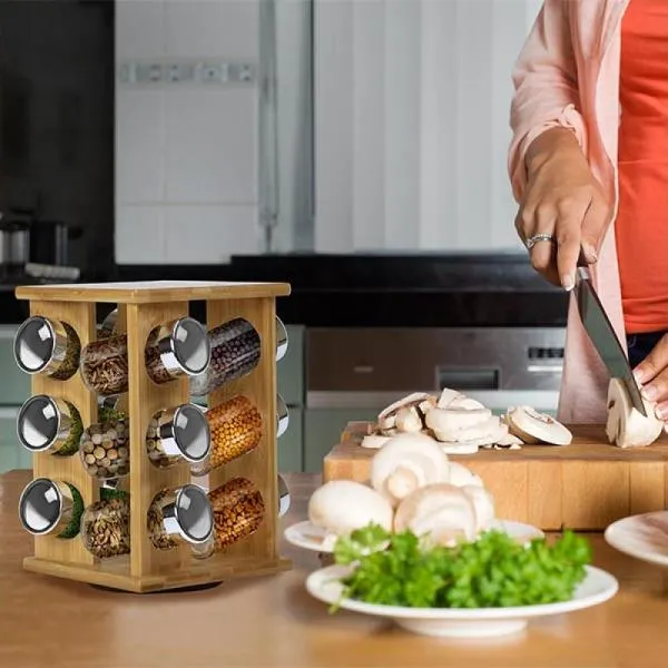 Porta Condimentos em Bambu/Vidro. Acompanha base giratória em Bambu e 12 porta condimentos em Vidro com tampa. Capacidade de cada porta condimento: 100ml