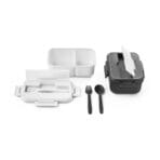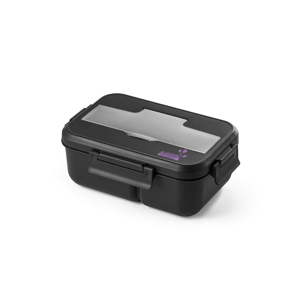 Marmita em PP com capacidade até 1 L. A tampa tem um compartimento para talheres (inclusos). A caixa é apta para micro-ondas (retirar tampa). Não aconselhável para líquidos. Certificação EU Food Grade. 210 x 145 x 80 mm