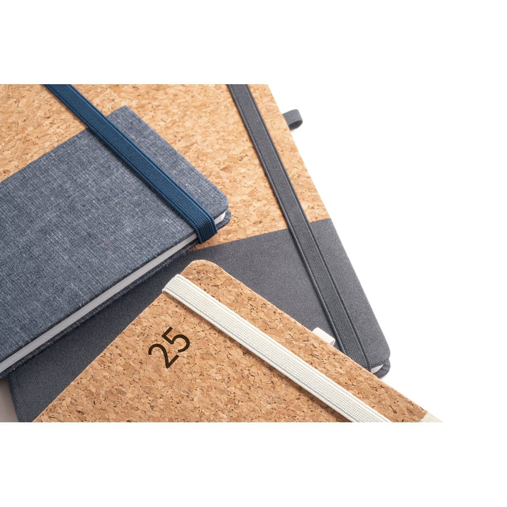Agenda A5 em cortiça e linho com suporte para esferográfica (não inclusa), marcador em fita e elástico para fecho na mesma cor. Está organizada num plano diário. Fornecida com bolsa de non-woven. 148 x 210 mm | Bolsa: 205 x 250 mm