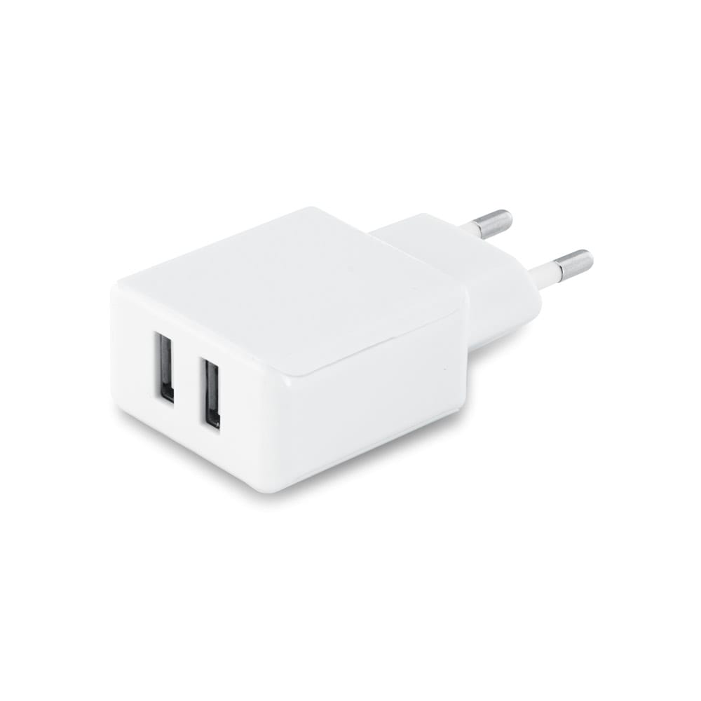 Adaptador de corrente em ABS com 2 portas USB-A. Potência máxima de carregameto rápido de 10W. 62 x 42 x 23 mm