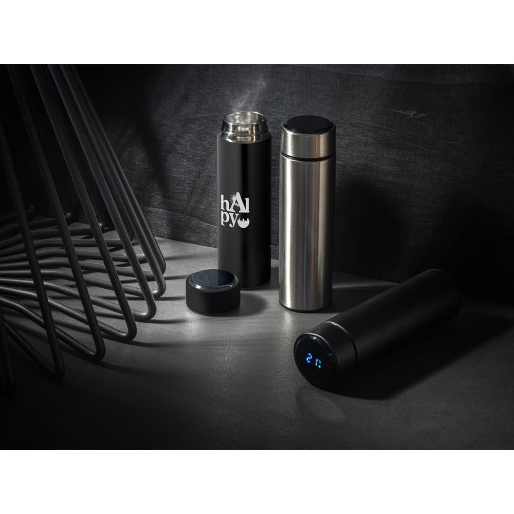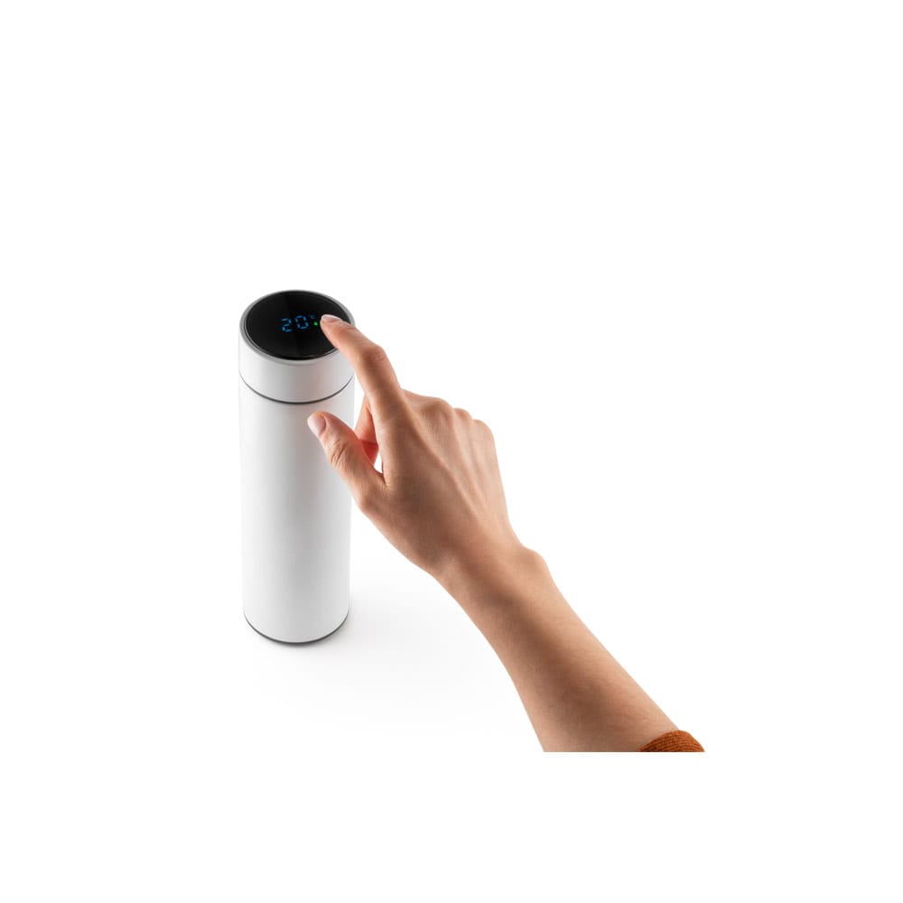 Garrafa em aço inox de parede dupla térmica, isolada a vácuo. Tampa com termômetro digital indicando a temperatura da sua bebida. Incluso infusor para chá. Mantém as bebidas quentes por 8 h e frias por 24 h e tem capacidade até 470 mL. Fornecido em caixa presente. Certificação EU Food Grade. ø65 x 229 mm