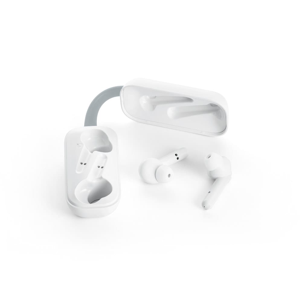 Fone de ouvido wireless stereo em ABS com transmissão sem fios BT v5.0 e autonomia aproximada de 3 horas. O estojo de carregamento, com uma bateria 250 mAh, é também em ABS e contém uma presilha em silicone que permite transportar e carregar os fones de forma fácil e confortável. Produto com cabo de carregamento micro USB incluso. Fornecido em caixa presente. 77 x 36 x 30 mm