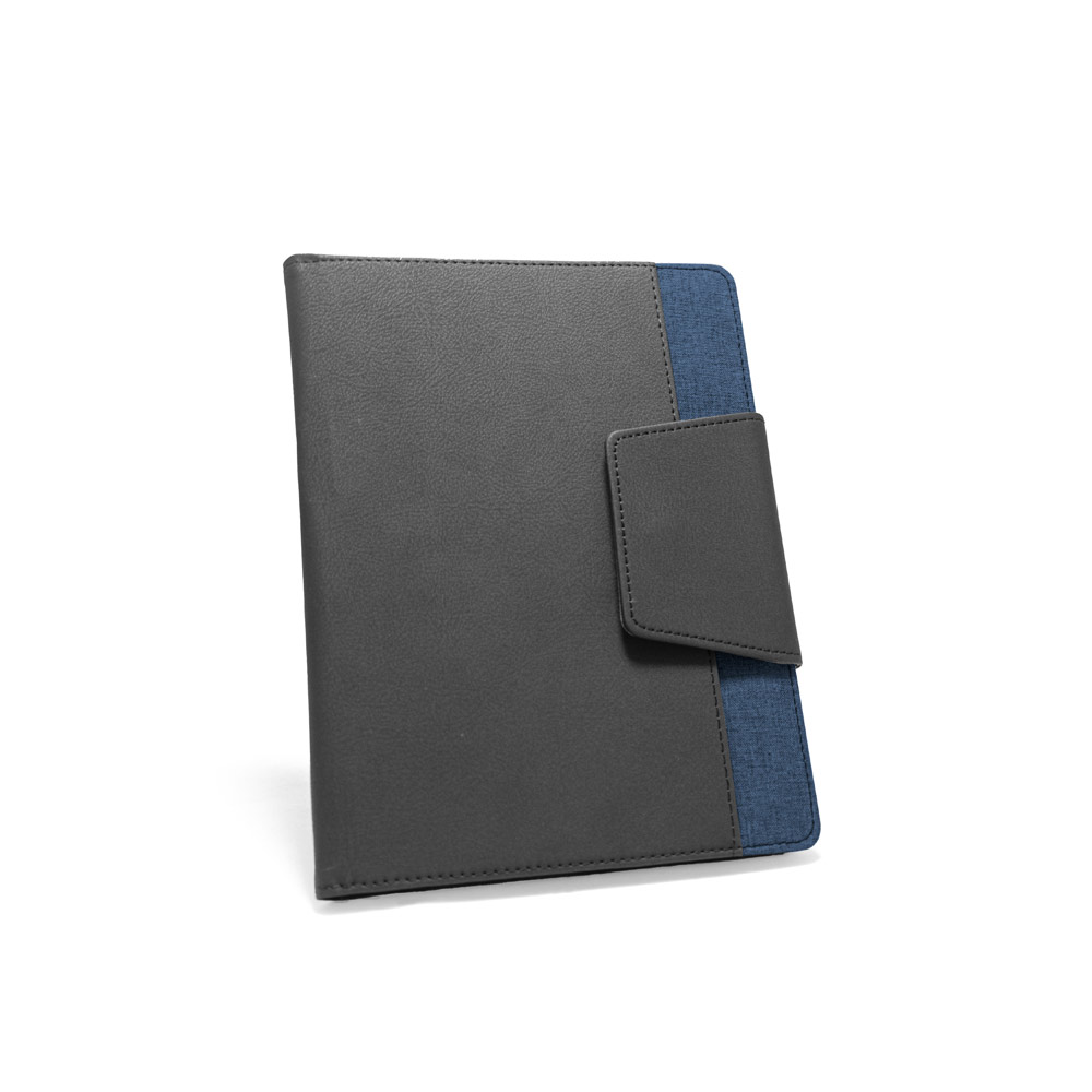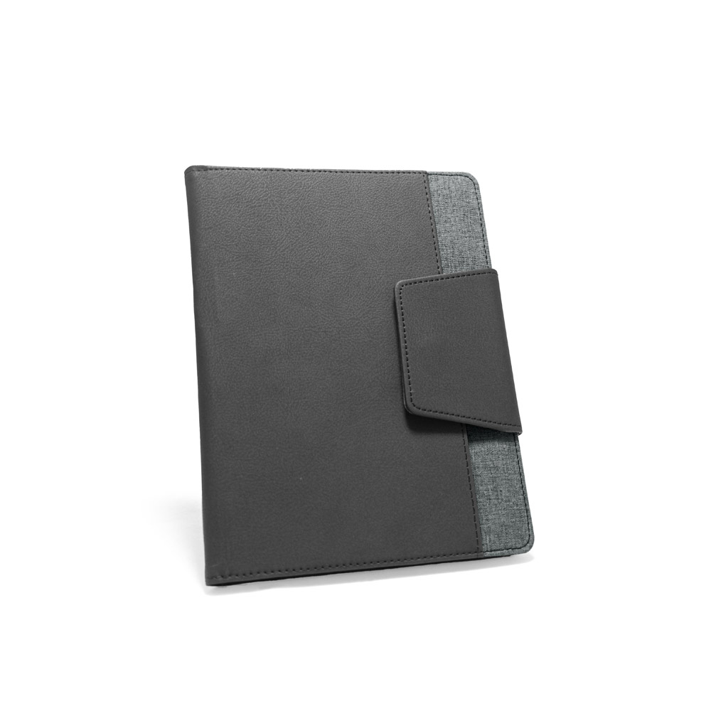 Capa em c. sintético e tecido em poliéster com caderno A5 removível com 80 folhas lisas. Contém fecho magnético, bolso exterior, bolso interior e suporte para esferográfica (não inclusa). Fornecida em embalagem de non-woven. 155 x 215 mm | Bolsa: 205 x 250 mm