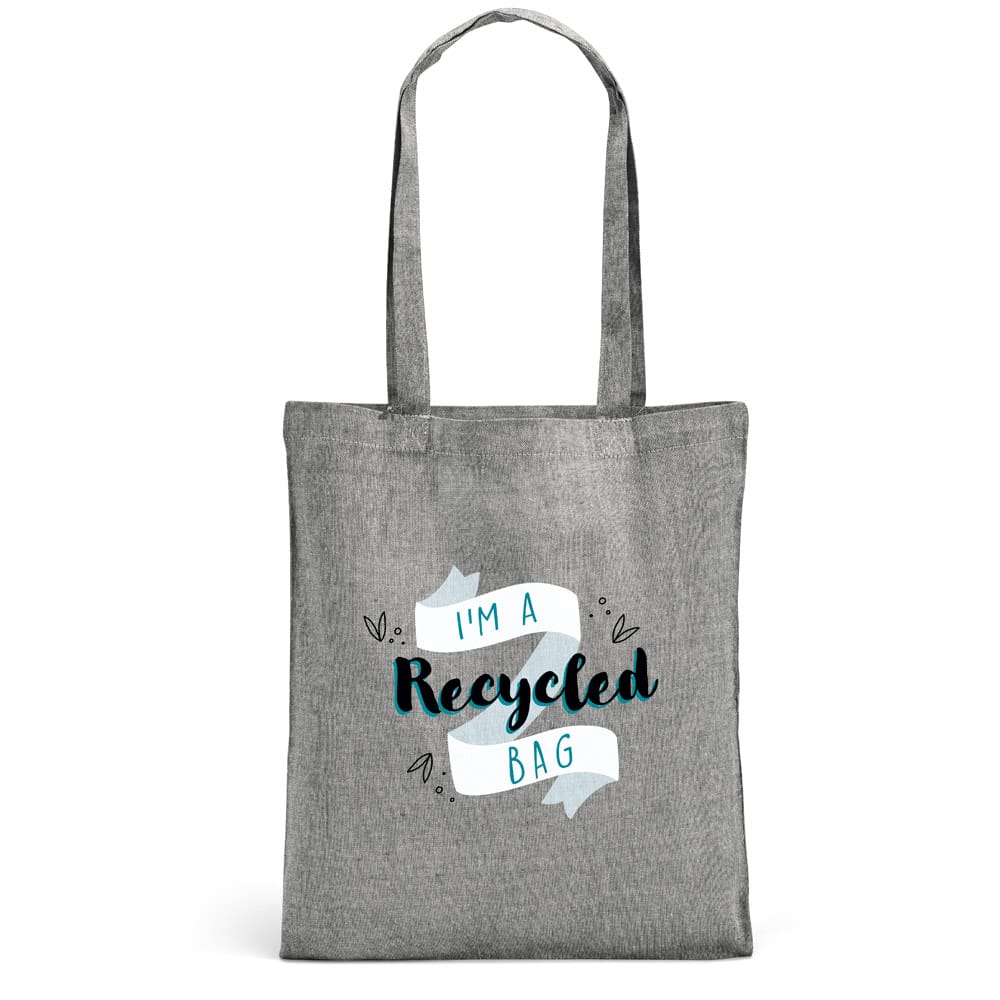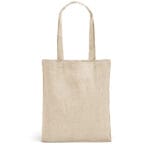 Sacola dobrável em 70% algodão reciclado e 30% poliéster reciclado (140 g/m²) com alças de 65 cm. O tecido é sem tingimento, é utilizado na sua cor original, sem produtos químicos de tingimento ou branqueamento, contribuindo para um menor impacto ambiental. 375 x 415 mm