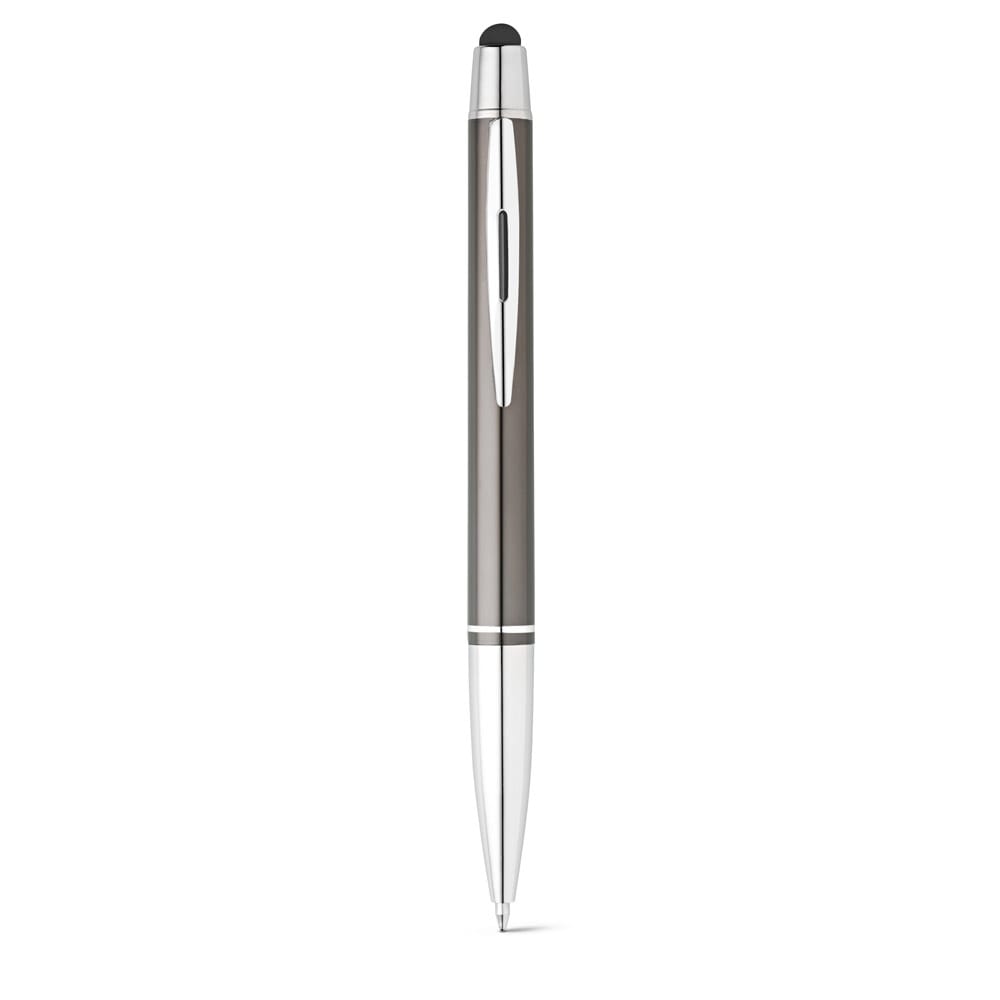 Esferográfica em alumínio com mecanismo twist, ponteira touch e clipe de metal. Até 1,5 km de escrita. Escrita em azul. ø11 x 135 mm