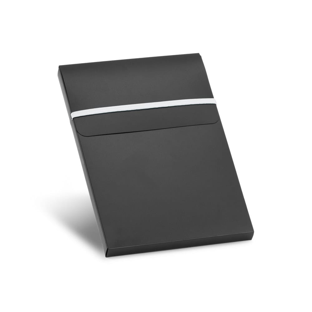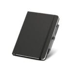 Kit de caderno A5 e esferográfica, caderno de capa dura em c. sintético com 80 folhas lisas, fita separadora e elástico. Esferográfica de escrita azul. Fornecido com caixa presente em PP com elástico. Esferográfica: ø10 x 137 mm | Bloco: 140 x 210 mm | Caixa: 155 x 214 x 13 mm