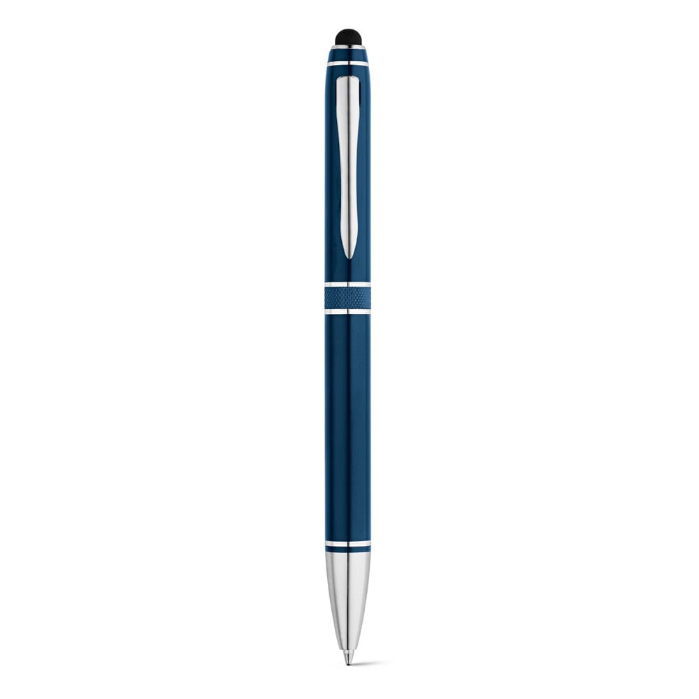 Esferográfica em alumínio com mecanismo twist, ponteira touch e clipe de metal. Até 2 km de escrita. Escrita em azul. Incluso embalagem de veludo. ø11 x 138 mm | Embalagem de veludo: 160 x 30 mm