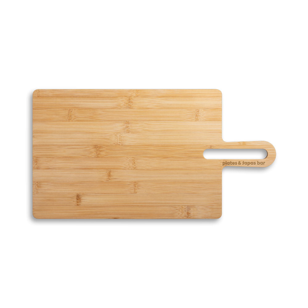 Tábua de servir em bambu com pega, de grande dimensão e de utilização versátil. Fornecido com caixa presente de papel kraft reciclado. Certificação EU Food Grade. A cor e o resultado da impressão nos materiais naturais pode variar entre produtos. 240 x 450 x 12 mm