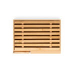 Tábua para pão em bambu com faca em aço inox. Grelha removível para fácil remoção de migalhas. Fornecido em caixa presente em papel kraft reciclado. Certificação EU Food Grade. A cor e o resultado da impressão nos materiais naturais pode variar entre produtos. 350 x 250 x 40 mm