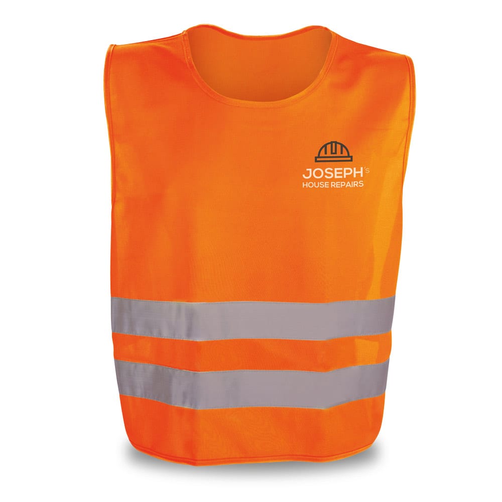 Colete de alta visibilidade em poliéster com certificado pela norma EN 17353. Colete refletivo com 2 bandas refletoras horizontais e elásticos laterais. 540 x 620 mm