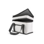 Sacola térmica em 600D poliéster reciclado (100% rPET). Contém 2 compartimentos principais com isolamento em PEVA para facilitar a higienização e um bolso frontal com zíper. Capacidade até 10 L. Certificação EU Food Grade. 280 x 230 x 160 mm
