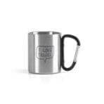 Caneca em aço inox, com pega em forma e função de mosquetão. Capacidade até 230 mL. Fornecido em caixa presente preta. Certificação EU Food Grade. ø70 x 82 mm